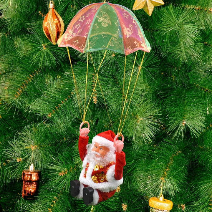 Papá Noel con paracaídas que gira automáticamente y reproduce melodías navideñas 🎵. Perfecto para colgar en ventanas, puertas o junto al árbol. 🎄💫